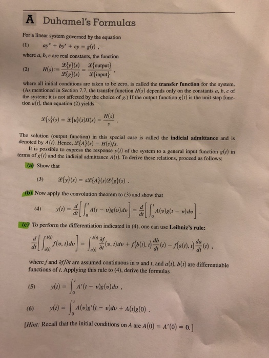 Solved A Duhamel's Formulas For a linear system governed by